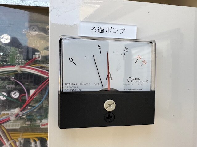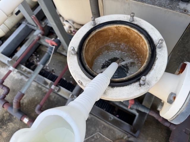 ろ過器の中、配管の中などに残っていた薬剤や汚れをしっかりすすいだら、仕上げに殺菌洗浄用の薬剤を投入し、しばらく循環していきます。