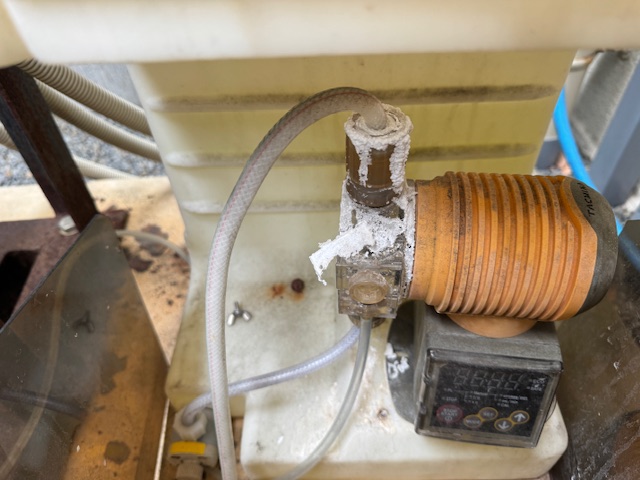 ↑これは、循環している浴槽水に点滴のように塩素を注入してくれる装置【薬注ポンプ】です。塩素が漏れて結晶化してしまっているくらい無残な姿に・・・汗。