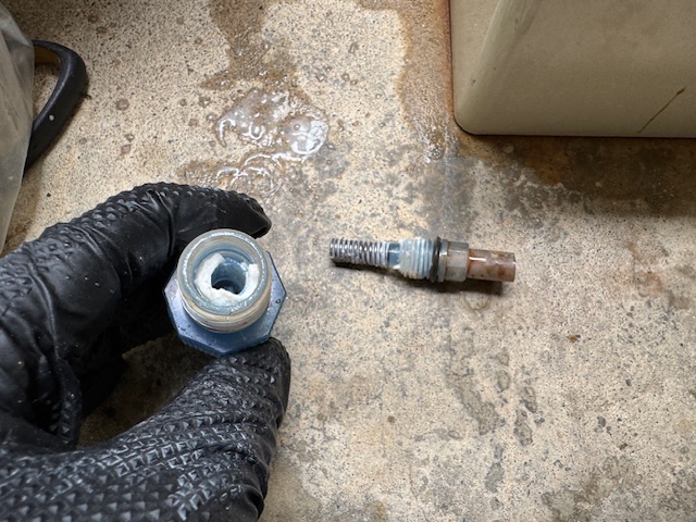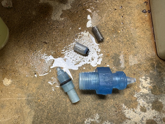 注入チャッキ弁を取り外し、分解してみると、塩素が結晶化して固まり、液体の塩素が注入される道を塞いでしまっていました。その為に、薬注ポンプに負担がかかって、はね返された塩素が薬注ポンプの方で漏れ出ていたという具合です。