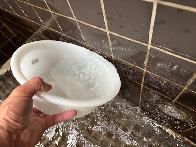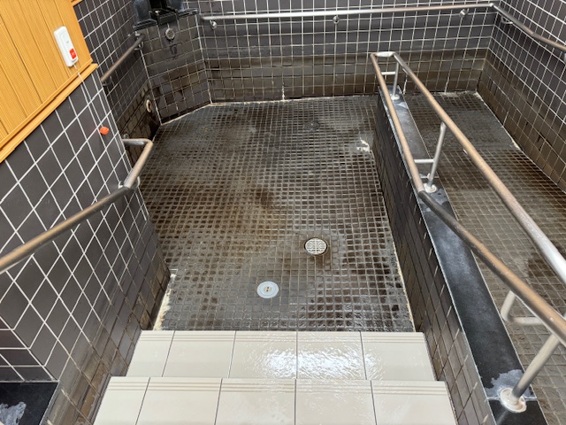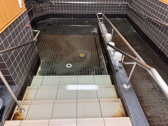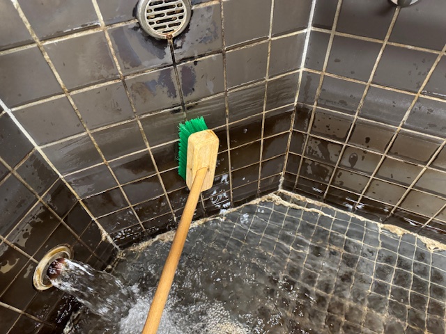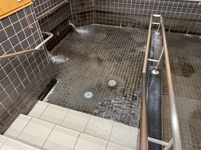 浴槽はこのような感じで、こちらでは頻繁に温泉を利用されている為、浴槽タイルに温泉成分が着色されていますが、それもまた温泉風情があって良いですね(^^) では早速洗浄していきます。