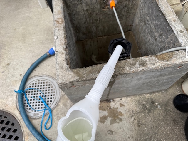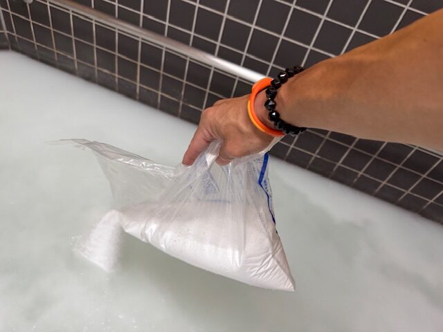 殺菌消毒用の薬剤を投入し、配管内や浴槽内を消毒していきます。