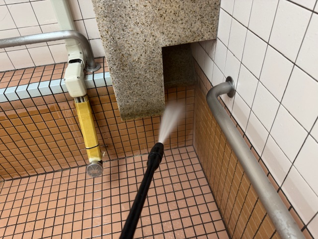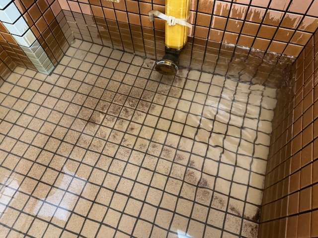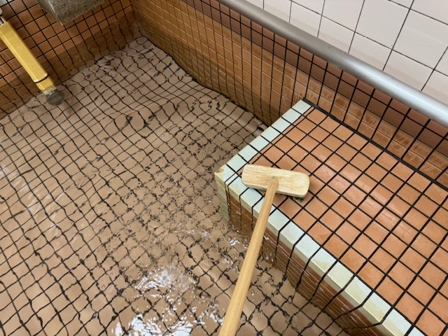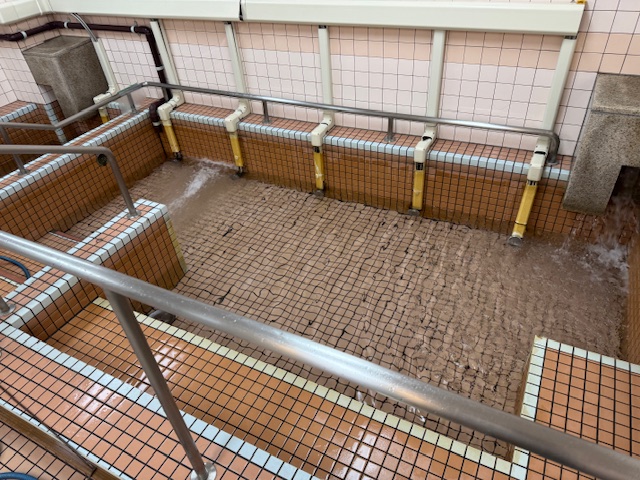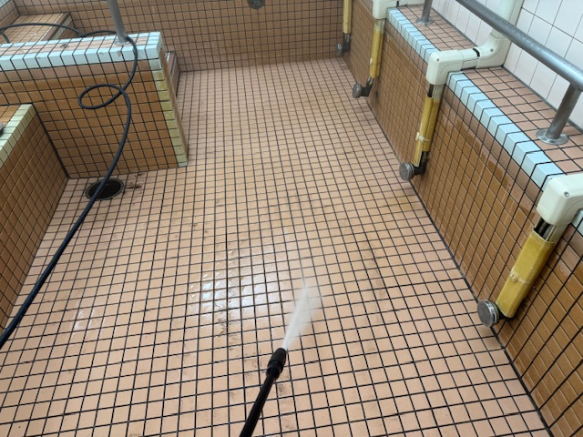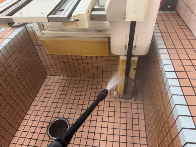 ろ過設備ほど洗浄すべき箇所はありませんが、浴槽内に露出配管などいろんな物が存在するので、それらの隙間で菌が発生してしまわないようにしっかり洗浄していきます。