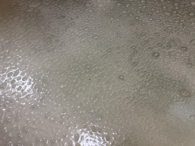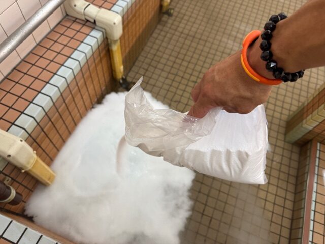続いて2つ目の薬剤で浴槽水を発泡させ、泡の力も借りながら汚れをかき出していきます。結構汚れが出てきましたね~(^^) 薬品の反応が終われば、一旦浴槽水を排水し、手作業で洗浄すべきところを洗浄していきます。