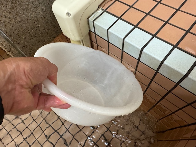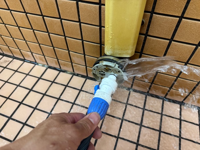 手作業の洗浄作業が終われば、一旦給湯器が循環できるくらいまで浴槽に水を溜め、循環させながら配管内に残った汚れや薬剤をすすいでいきます。