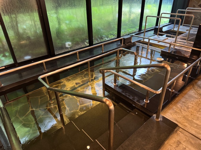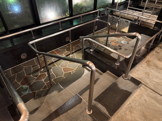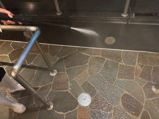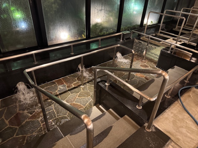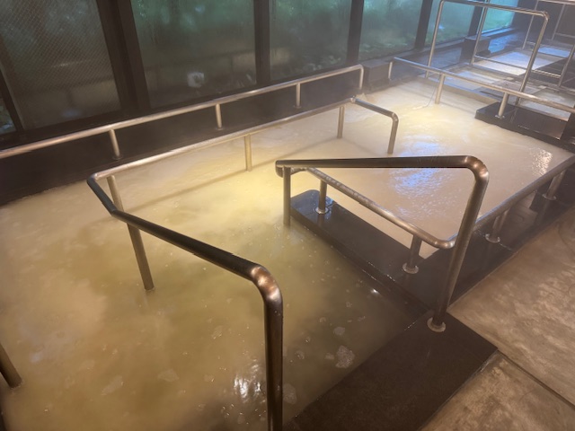 今回洗浄するのは、高級感溢れる有料老人ホーム様の大浴場です。露天の景色を眺めながら、岩風呂のような浴槽で癒されておられる様子が伝わってきます(^^) 奥には、車いすのまま入浴できる「リフト浴」が2基も設置されており、要介護度の高い方でも入浴が愉しめるように工夫されておられます(^^) それでは、早速「見えない汚れ」の洗浄作業に取り掛かります(^^)v