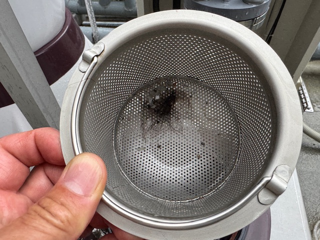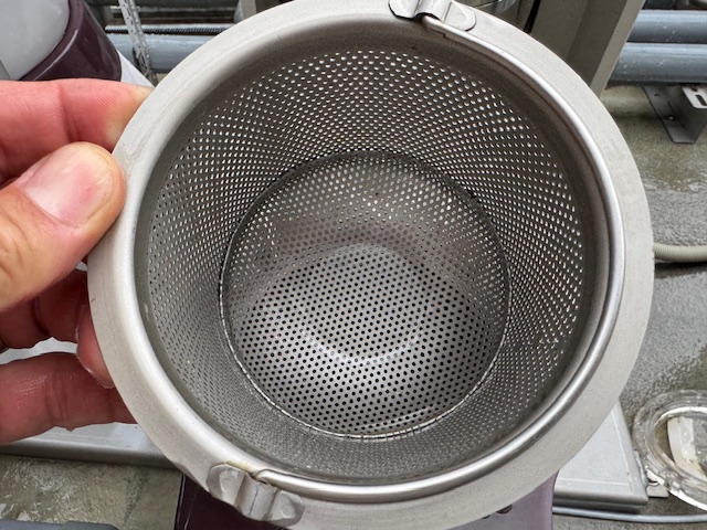 これは【ヘアキャッチャー】(集毛器)と呼ばれる、浴槽水を循環している途中に設けられているストレーナーのような物で、浴槽水を循環している【ろ過ポンプ】の手前に設置されている事がほとんどです。役割としては、浴槽水に紛れている人毛やバンドエイドなどのゴミを除去し、ろ過ポンプに異物が入るのを防ごうとしてくれています。このヘアキャッチャーの清掃を怠ると、ゴミが循環を邪魔してしまい、正常なろ過運転ができなくなったり、ヌメリの発生によって菌が繁殖してしまう場所でもあります。
