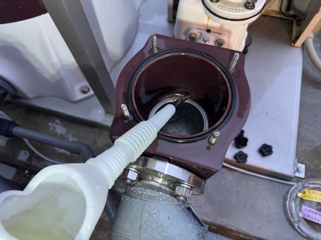 水位計配管内の汚れを吐き出したら、殺菌用の薬剤を流し込み、しっかりすすいでいきます。