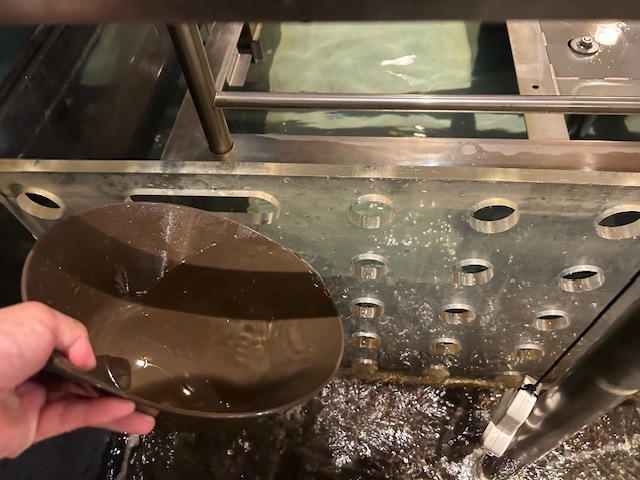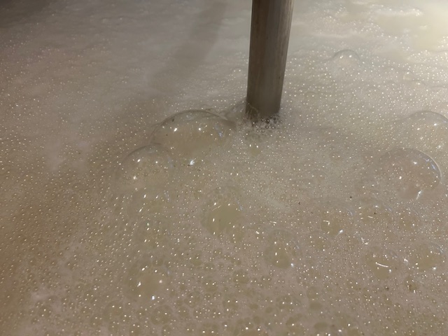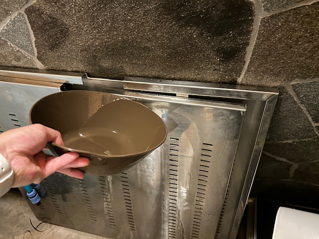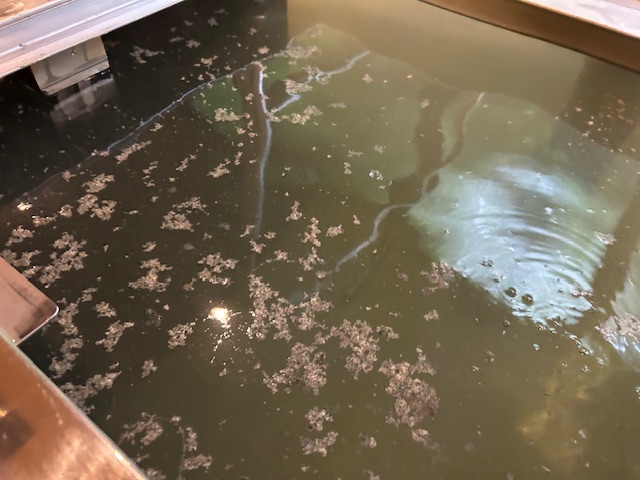 循環が進んでいくと浴槽に汚れが浮き出てくるので、これらの汚れや薬剤の反応を見ながら一旦循環を終え、薬剤を排水して、次の工程へと移ります。