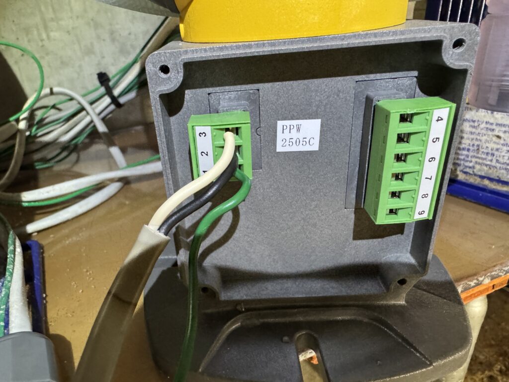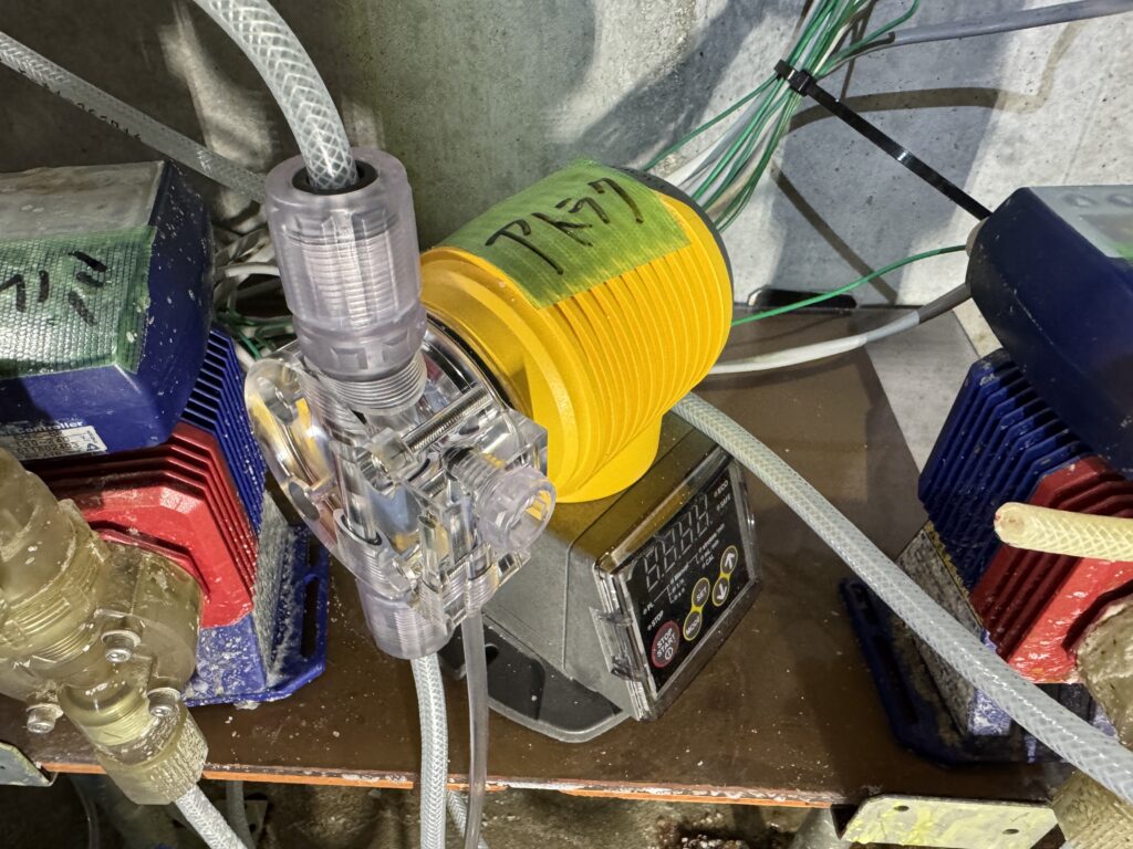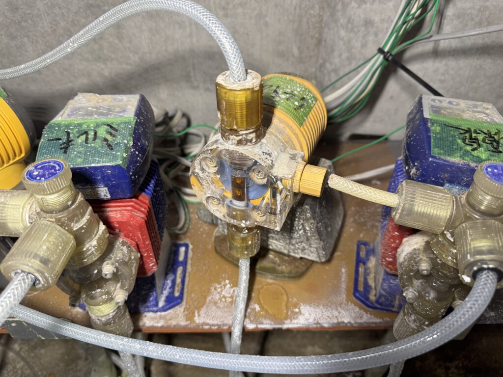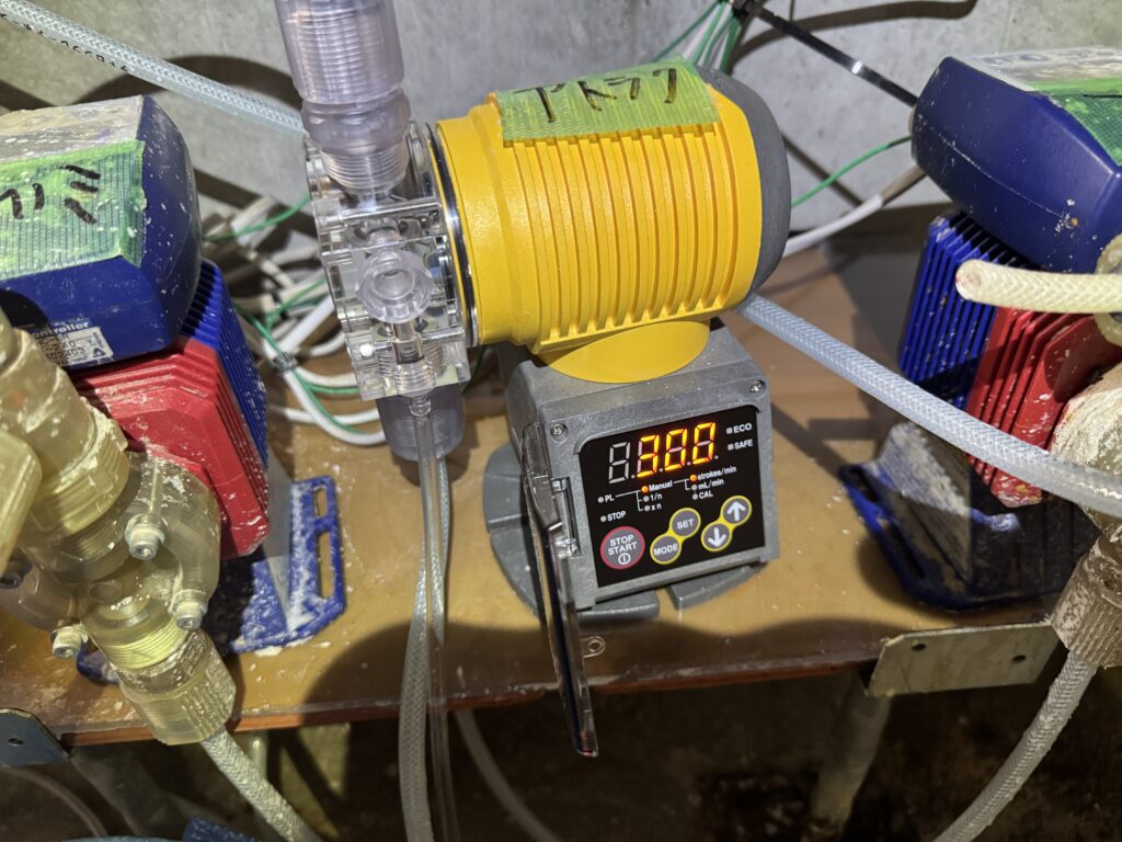今回取り替えるのは、この真ん中の黄色い薬注ポンプです。部品の破損などで液漏れが止まらなくなったので、早速取り替えます(^^)v