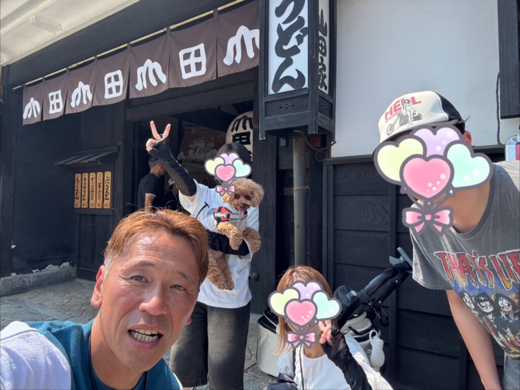 橋の途中の豪風で、みんな髪型ぐちゃぐちゃでしたが、記念にパシャリ📷(^^) 少しお腹も減ってきたという事で、香川県の最初の目的地のうどん屋さんへGo!